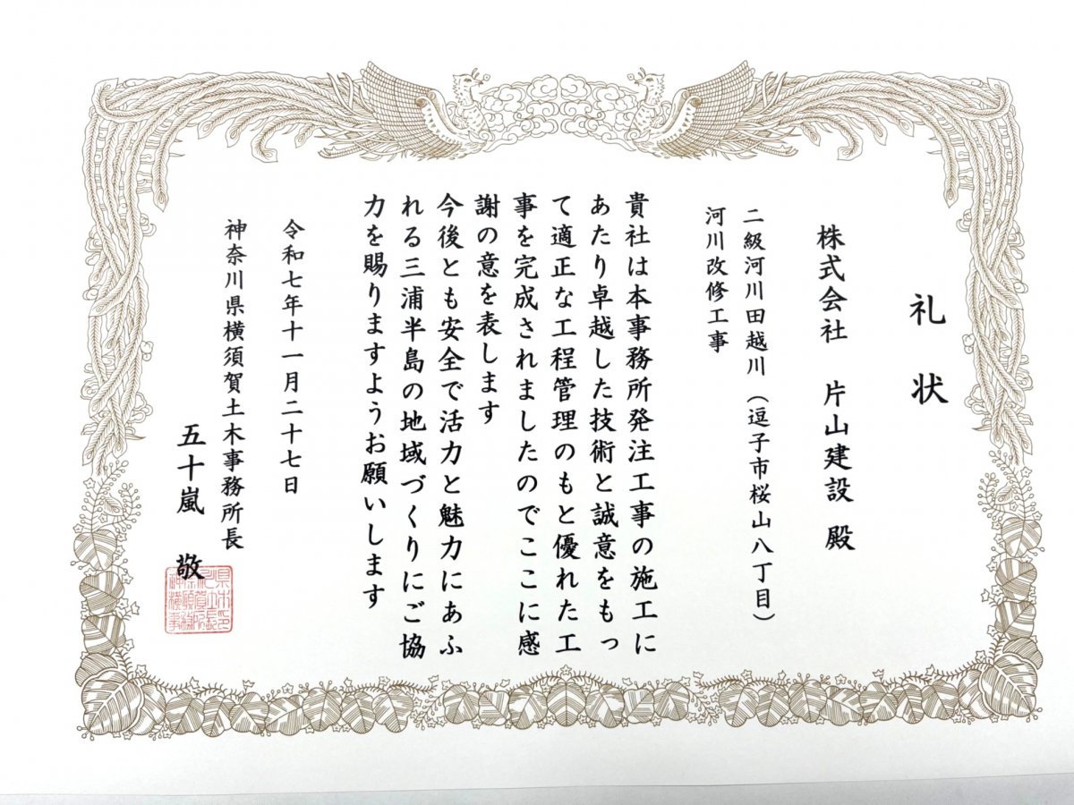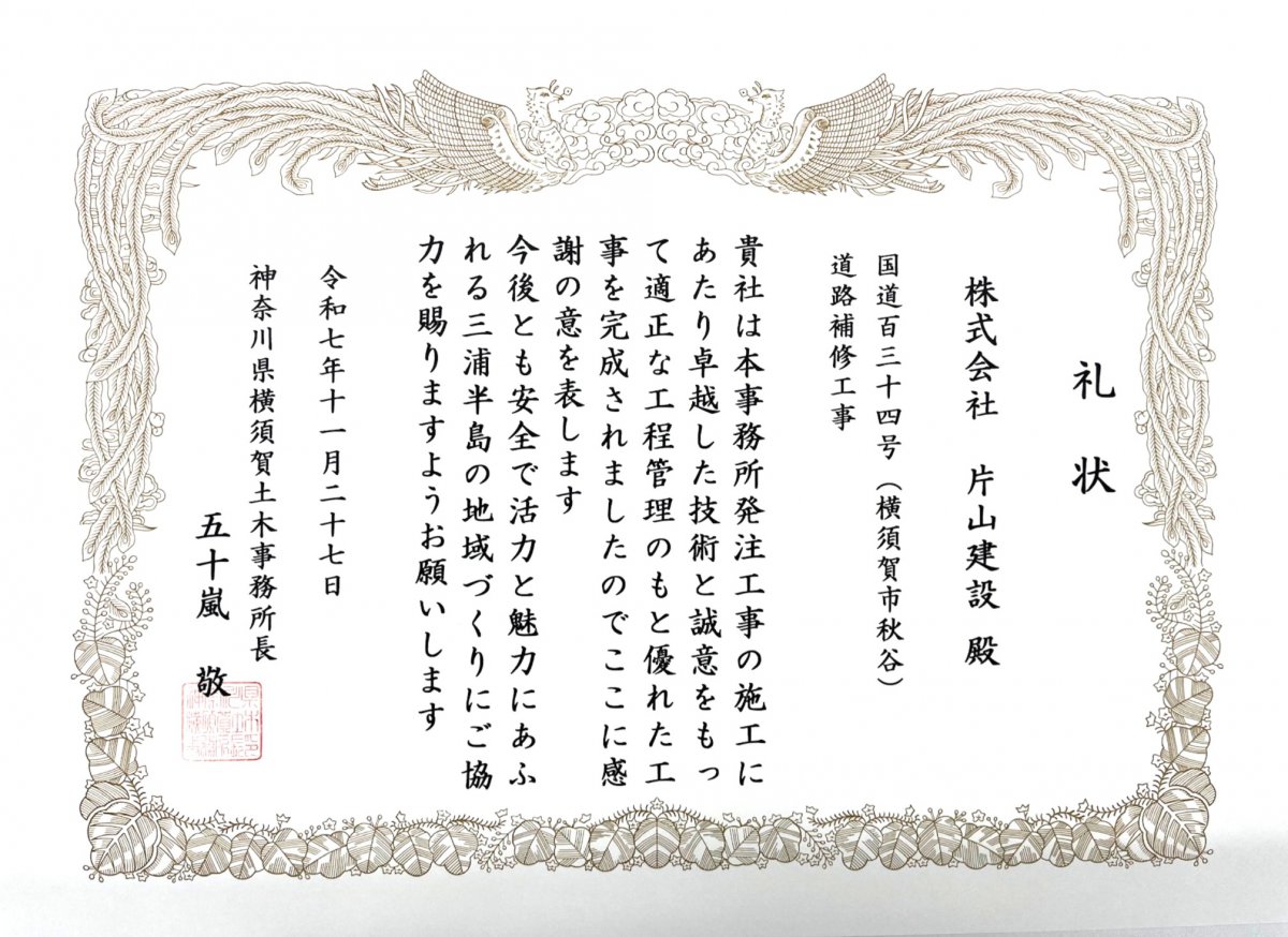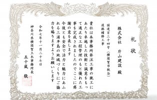 令和6年度に弊社が施工しました、以下の3件の工事が神奈川県横須賀土木事務所長より表彰されました。