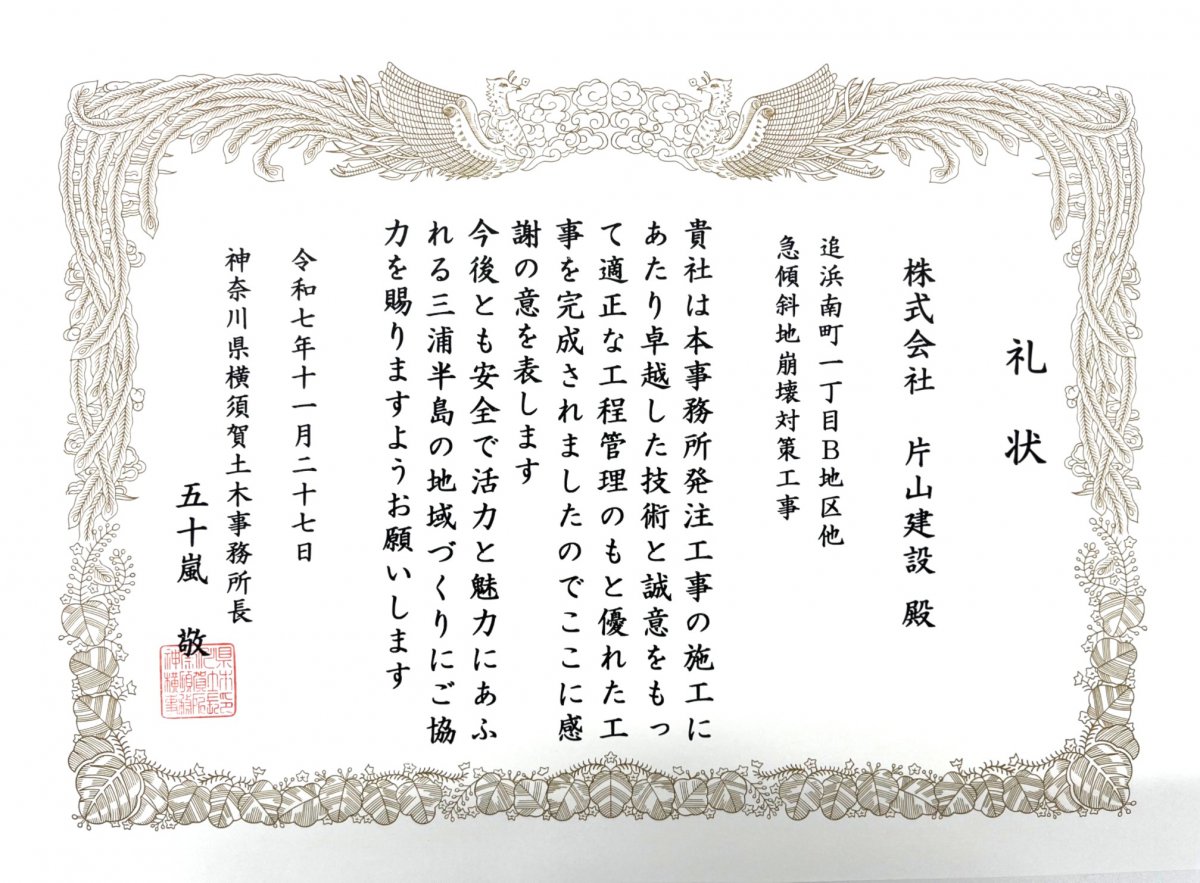 令和6年度に弊社が施工しました、以下の3件の工事が神奈川県横須賀土木事務所長より表彰されました。