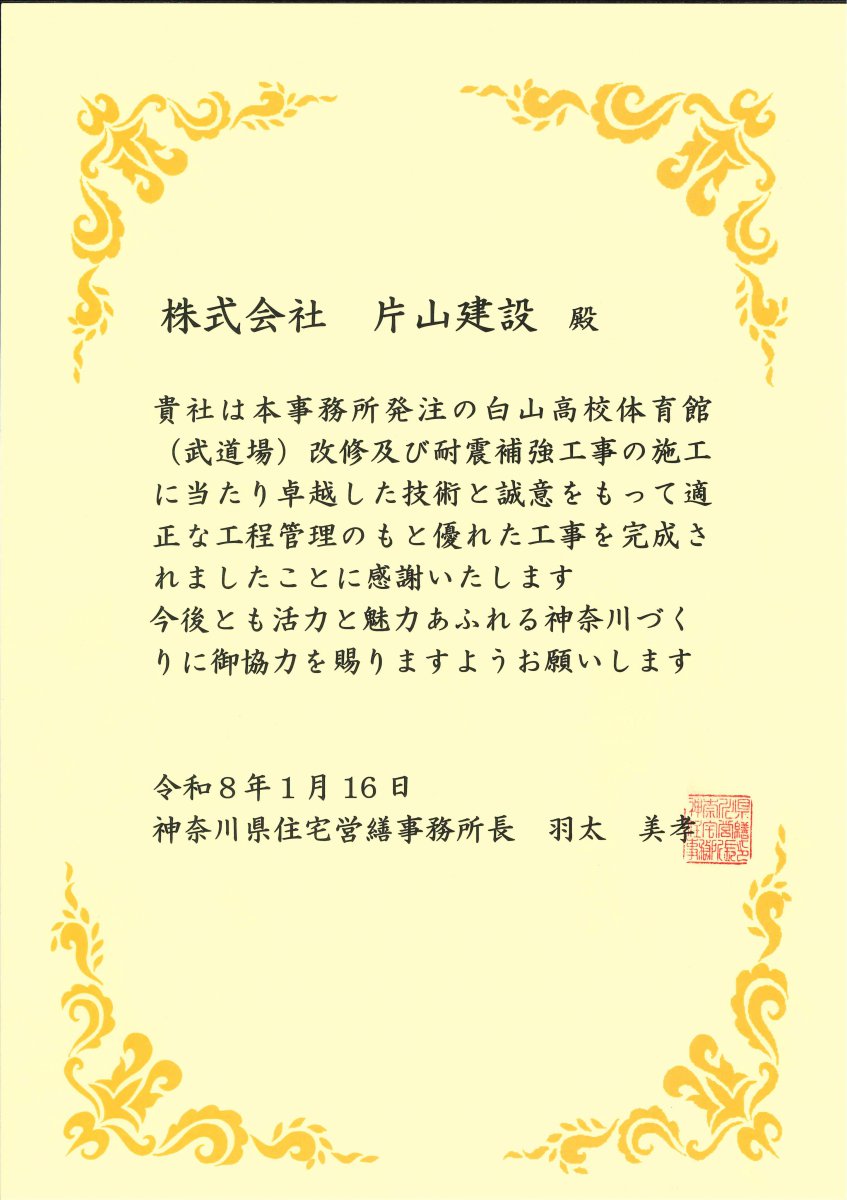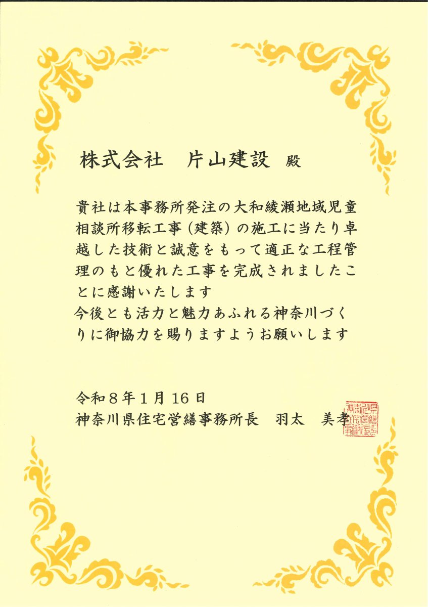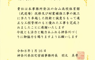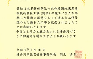 令和8年1月16日に、弊社が施工しました建築工事2件が神奈川県住宅営繕事務所長より表彰されました。